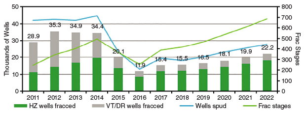 Over the coming 12 months, IHS Markit estimates that operators will regulate the drilling pace to allow completions to get caught up, projecting the number of new wells to decline modestly and the number of horizontal wells fractured to increase slightly compared with 2017, Jacob reveals. Longer term, however, he says IHS Markit forecasts healthy year-over-year growth in the numbers of wells drilled and fractured, returning annual horizontal well completion counts for 2019-22 to levels roughly on par with the 2012-14 timeframe.