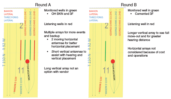 Round B monitored the Mason 2-11HX, a cemented Three Forks lateral that was used as a monitoring well in round A. The only monitoring well was the George Evans 11V. The vertical observation well used a 50-tool DS150 sensor array with 49.2-foot spacing between levels. All but one of the 19 completed stages were monitored, and 550+ microseismic events were located.