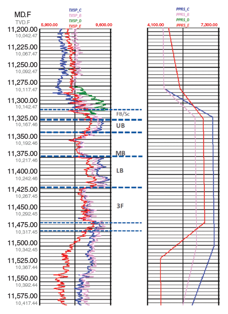 Other than frac data, the main inputs into GOHFER were the petrophysical and geomechanical models. The final pore pressure and minimum horizontal stress curves used in the GOHFER modeling are shown in red in Figure 3 (Model E) along with the various iterations that were tested before arriving at the final model.