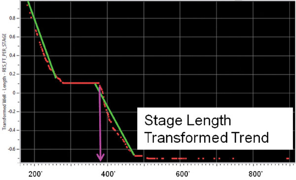 Completion variables used in the multivariate analysis included lateral length, stage lengths (plug-to-plug or sleeve-to-sleeve), proppant volume per foot, proppant type, and treatment rate. These variables were controlled easily by the frac design, they had known measureable values, and available public data could be incorporated from third-party operators. The transformed variable trends also were supported by other datasets.