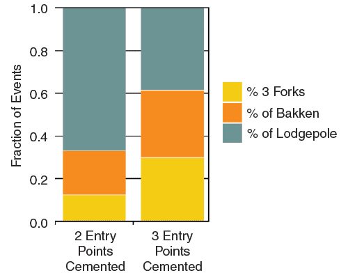 For example, in Figure 3, an average of only 14 percent of the events are in zone. An average of vertical containment was calculated for each isolation type and entry-point type combination. This analysis showed that cemented liners were superior to their open-hole counterparts.