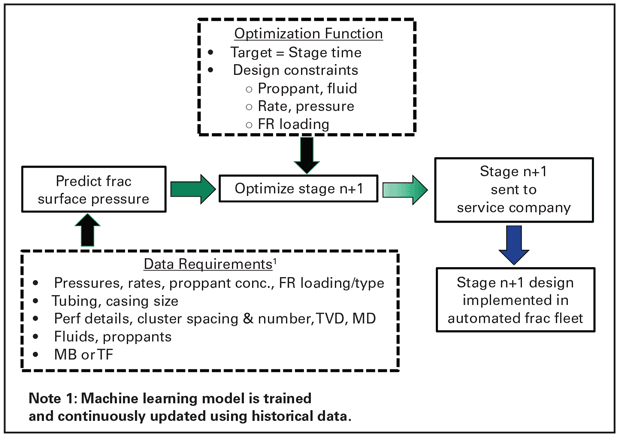 In an early iteration, Hess’ vision for AIF involved developing a machine learning model to accurately predict fracture treatment pressures and provide recommendations for improving subsequent stages. Figure 1 shows the model, which was successfully assessed in 2021. The data requirements for this model were fracture treatment design and completion parameters. Semi-real-time inputs included rate, treating pressure, proppant concentration and friction reducer loading.