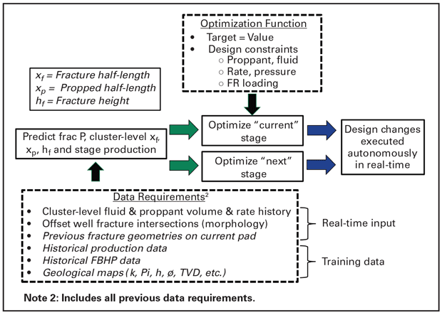 Figure 2 shows Hess’ current vision for AIF, illustrating the ambitious goal of predicting stage-level production to enable an optimization function that targets value. Realizing this vision will require much more sophisticated and fast models that can predict cluster-level fracture geometry. These models require real-time or semi-real-time measurements of fluid and proppant volume injected into each cluster and measurements to constrain fracture length and morphology.