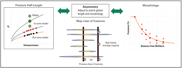 With inputs of volume injected into each cluster from permanent fiber optics or estimates of stage-level fluid uniformity indexes from surface measurements, the model predicts the length of each fracture using the cluster-level in-zone and out-zone curves. This is illustrated in Figure 3 for a six-cluster stage (left graphic, bottom two curves), with different fracture lengths for each cluster predicted using the in-zone (small red dots) and out-zone (small black dots) length-volume curves. The model then uses variations in asymmetry for each fracture to match the morphology behavior (right graphic in Figure 3).