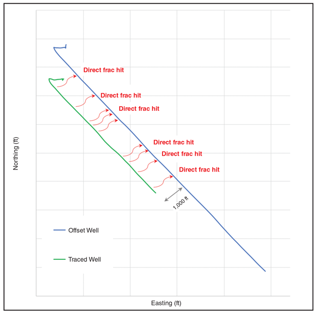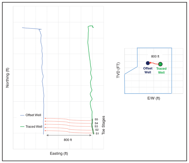 Notably, subatomic analysis of smart tracer recoveries showed direct frac hits between the traced horizontal well and the offset horizontal well, with a lateral interwell spacing of nearly 800 feet (Figure 3). Thus, the unexpected results yielded insight that could lead the operator to rethink the fieldwide vertical and horizontal well placement strategy.
