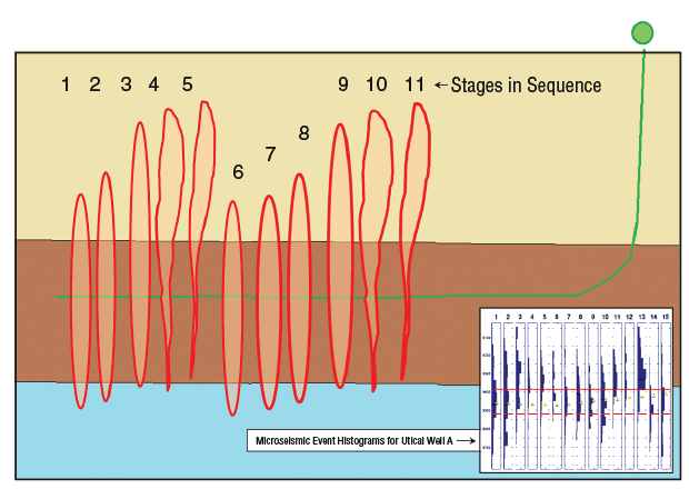 Our concept of stress shadowing’s impact on hydraulic fractures is represented schematically in Figure 1, based on microseismic analysis of a horizontal Utica Shale well. As closely spaced hydraulic fractures develop and interact during a frac stage, stress begins accumulating in the target zone. The stress shadow created increases the minimum horizontal stress in the zone, thereby gradually reducing the stress contrast with the natural barriers that contain the fractures.