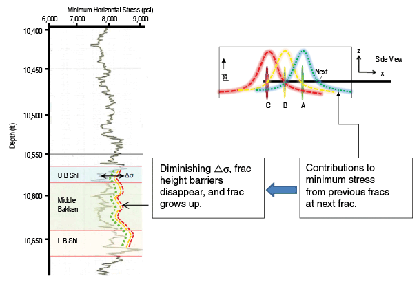Figure 6 shows the original in-situ stress estimated from logs in a vertical Bakken well. The right side of the figure illustrates how stress shadowing increased the minimum horizontal stress after three parallel fractures were generated. The dashed lines show the sequentially elevated minimum stress (stress shadow) as fractures were added.