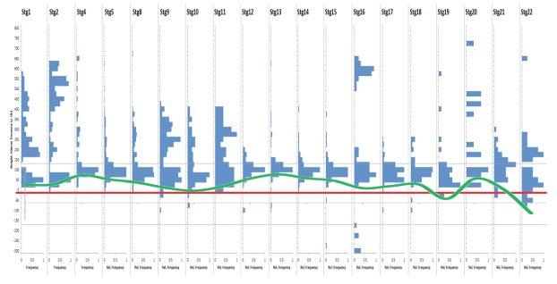 Quantile analysis measures the depth of a portion of the histogram. For values that change slowly from one stage to the next, it is a reasonable way to track bounces. Faulting and pump pressures may affect the top of the histogram depth range in any given stage. Following the bottom of the histogram seems best for tracking cycles related to stress shadowing.