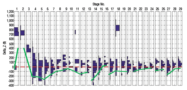 Beginning with the first stage at the toe of the well (left side of the plot), fractures are centered at the borehole. The fractures in the following stages gradually moved upward about 200 feet (stages 3 through 6). They subsequently returned to the borehole in the middle of the well (stages 7 through 10), and the pattern repeated.