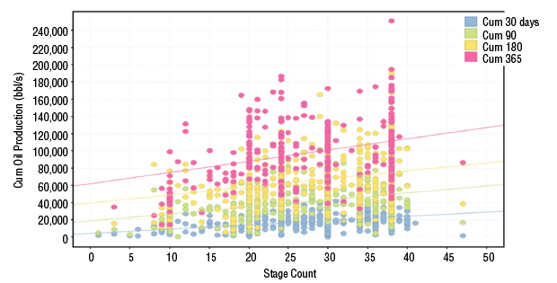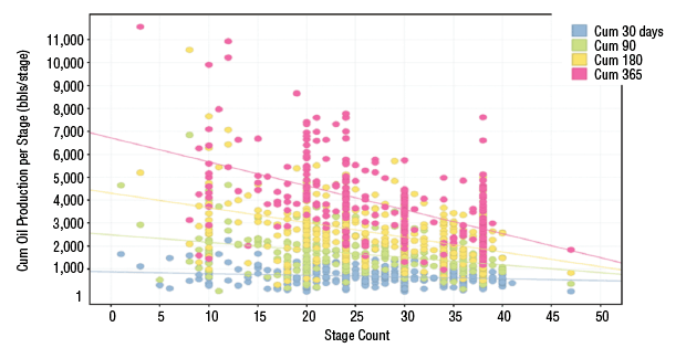 Bakken Production per Stage versus Stage Count (After 30, 90, 180 and 365 Days)