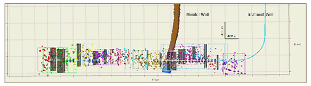 The results from the 29-stage well C (Figure 8) include obvious faulting effects. Stage 2 in the hybrid completion design included an 8- to 10-foot fault identified by geosteering. In this stage, points climbed to 900 feet above the zone of interest. As successive stages were pumped, the points came back to the borehole, indicating that fluid was being emplaced at the level of microseismic activity, and that the associated stress shadow in that interval was providing enough additional stress contrast to limit height growth in following stages.