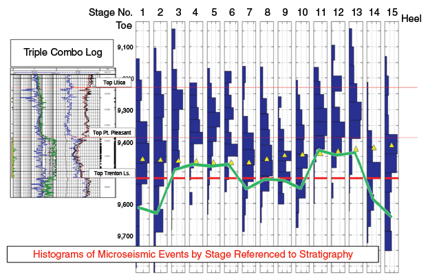 Figure 3C shows calculated histograms of relative frequency of points by depth above the Trenton Limestone (red line) for each stage (the Trenton formation is a prominent carbonate platform underlying the reservoir section). The yellow triangles indicate the average perforation depth for each stage.