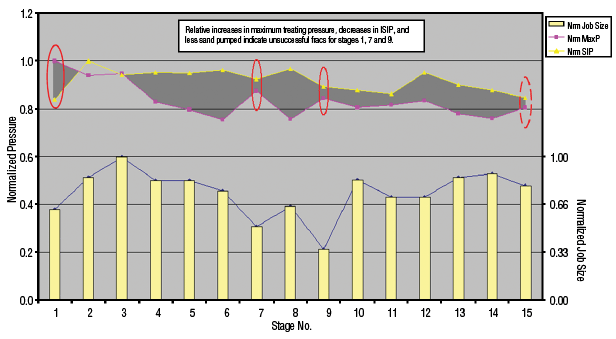 Figure 4 shows normalized instantaneous shut-in pressures (ISIPs) (yellow line), normalized maximum treatment pressure (pink line), and normalized job size index using a product of sand and water pumped (yellow bars) from well A. Comparing these data to Figure 2C, the observed out-of-zone bounces coincide with systematic changes in ISIPs and maximum pressure, as well as difficulty in placing the entire job (indicated by shorter yellow bars).