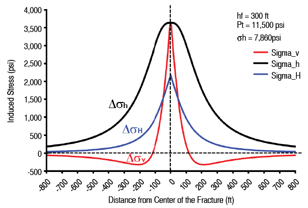 The treatment pressure exerts a compressive stress in the direction normal to the fracture on top of the minimum in-situ stress that is equal to the net pressure at the fracture face, but quickly falls with distance from the fracture. At a distance beyond one fracture height, the induced stress is only a small fraction of the net pressure.