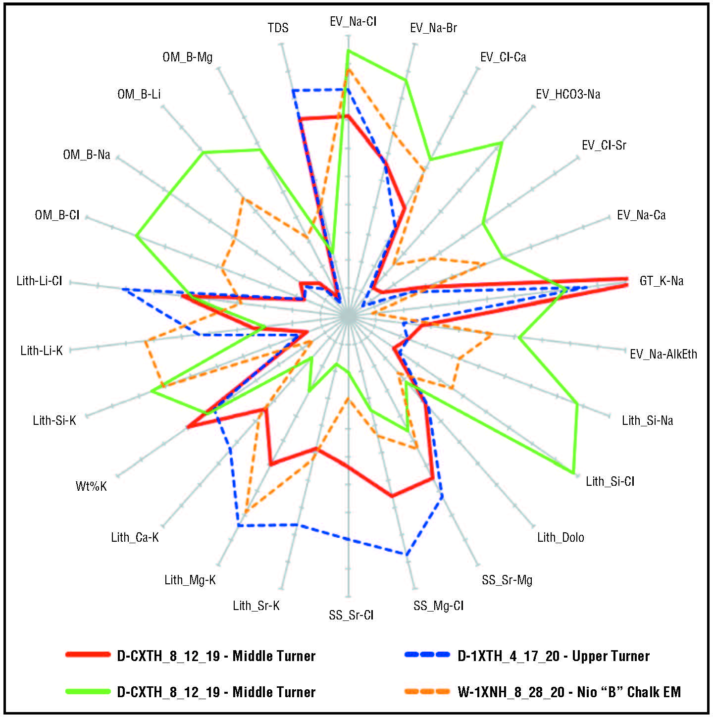 On each axis is one of the parameters used, with the position organized into categories: water evolution (EV), geothermometers (GT), lithology (Lith), salinity source (SS) and organic matter related (OM). Multiple factors can impact the value of each parameter. For example, any parameter for water evolution also is influenced by lithology parameters, which in turn, are influenced by temperature and maturity, etc. Some trial and error is necessary to develop radar plots for each area, to constrain plots to parameters constructed with available data, and to determine useful scale ranges for comparing water chemistries of contacted reservoir intervals.