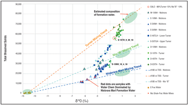 Much greater variation is apparent when analyzing a cross plot of oxygen isotopic composition versus TDS or chloride concentration (Figure 2). In comparison with makeup water (~800 TDS mg/l), Niobrara/Marl formation water has ~20,000-23,000 TDS mg/l, Niobrara B water has ~37,000-43,000 TDS mg/l, and Turner formation water has ~73,000-83,000 TDS mg/l. These values are important inputs for water unmixing and allocation since they determine the relative impact on water chemistry for equal volumes of different water types.
