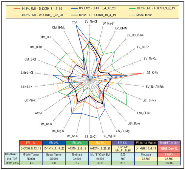 Figure 3 shows the output graphic solution for a water sample from the D-1XNH Niobrara B well. The volume percent estimated for each end-member is provided in the legend, as well as in the table below the radar plot. Also included in the table are the input values used for the estimated salinity of the formation water, the salinity of the water modeled and the salinity of the modeled solution.