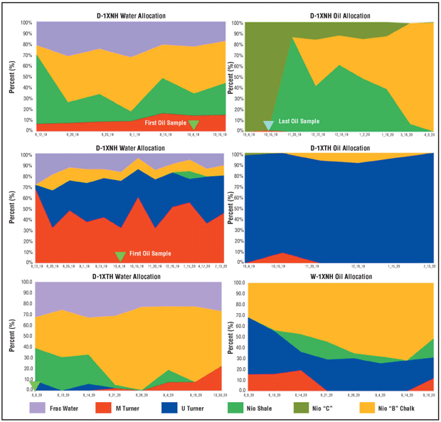 Figure 4 shows water and oil unmixing results for TLG studies of three wells. In the first two wells (D-1XNH and D-1XTH), early oil samples were destroyed during shipment and the green inverted triangles mark the time on the water allocation summary chart where the first oil sample analysis was available. For D-1XNH, the quantity of water had decreased greatly and was not sampled after Oct. 16, 2019, as shown by the blue inverted triangle on the oil allocation summary.
