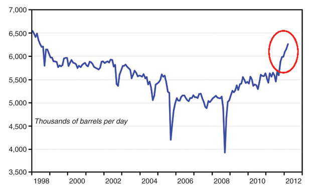 The success seen in stimulating these unconventional sources of oil has been truly astounding. Reservoirs such as the Bakken and Eagle Ford have taken over the top two spots in U.S. productivity, while the venerable Permian Basin is seeing a massive resurgence, all driven by this combination of hydraulic fracturing and horizontal drilling. Figure 2 shows the very strong growth in U.S. oil production as a result of this technical success. As with natural gas supply, operators have dramatically reversed a long downward trend of annual domestic oil production.