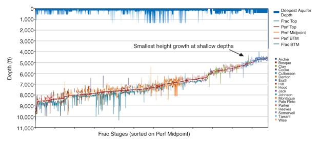 Various special interest groups, with assistance from the media, speculate that hydraulic fracturing operations can contaminate the environment and cause earthquakes. Two high-profile claims of contamination in the Marcellus Shale and Barnett Shale have since been proven incorrect, but there remains a concern that fracturing may somehow grow from deep in the earth, up into aquifers, and contaminate water with frac fluids or hydrocarbons from the reservoir. Studies have been performed utilizing microseismic and tiltmeter data from almost 20,000 fracture treatments in numerous shale basins, and there is not a single instance where significant upward growth was measured that could threaten an aquifer (Figure 3).