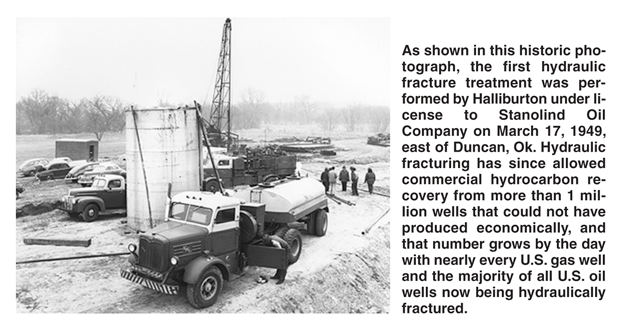 Jump back in time to March 17, 1949. A team composed of Stanolind Oil Company and Halliburton personnel converged on a well 12 miles east of Duncan, Ok., to perform the first commercial application of hydraulic fracturing. Later the same day, Halliburton and Stanolind personnel fractured another well near Holliday, Tx. The technique was developed and later patented by Stanolind (later known as Pan American Oil Company) and an exclusive license was issued to Halliburton to perform the process. Two Stanolind inventors filed separate patents on New Year’s Eve, 1949. In 1953, the license was extended to all qualified service companies.