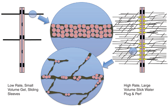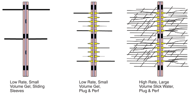 The ability to create complexity and reservoir contact area through a fracture system depends on the well completion and the fracture treatment design.