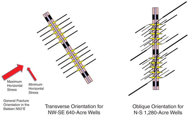 This has resulted in wells being drilled primarily in a north-south orientation, while the preferred fracture plane in the Williston Basin is at an oblique angle with an orientation at about north 50 degrees east. As shown in Figure 2, enhanced screen-out risk is associated with oblique fractures.