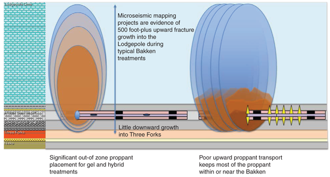 Poor proppant transport in slick-water treatment is beneficial for in-zone proppant placement. Upward out-of-zone fracture height growth is virtually impossible to control in the Bakken, even at low injection rates, while downward growth generally is limited because of higher stresses in the Three Forks formation. As the hydraulic fracture system generally grows upward by hundreds of feet into the Lodgepole formation, poor proppant transport minimizes proppant placement across this zone with potentially high water cut and the presence of hydrogen sulfide, placing most of the proppant in the zone where it can aid Bakken oil production.