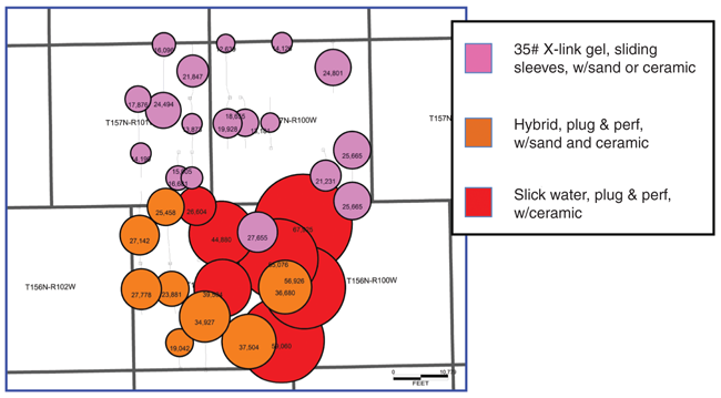 To evaluate production performance for the slick-water-only design, we compared production results in a relatively small area of the Bakken Central Basin, where a variety of completion designs where implemented in a statistically relevant number of wells. We chose the area within and surrounding Township 156N-R101W in Williams County, N.D., since this is one of the main areas where Liberty Resources holds acreage.