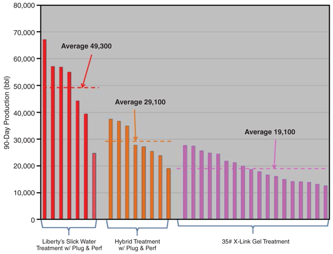 As can be seen, the three completion and stimulation designs have large variations in 90-day cumulative production. Averages range from 19,100 barrels of oil for gel with sleeves, 28,800 bbl oil for hybrid plug and perf, and 49,300 bbl oil for the slick water only strategy. Clearly, with wellhead commodity prices of more than $80 a barrel, the increased time and costs of the P&P completion design with slick-water fracturing is highly economic.