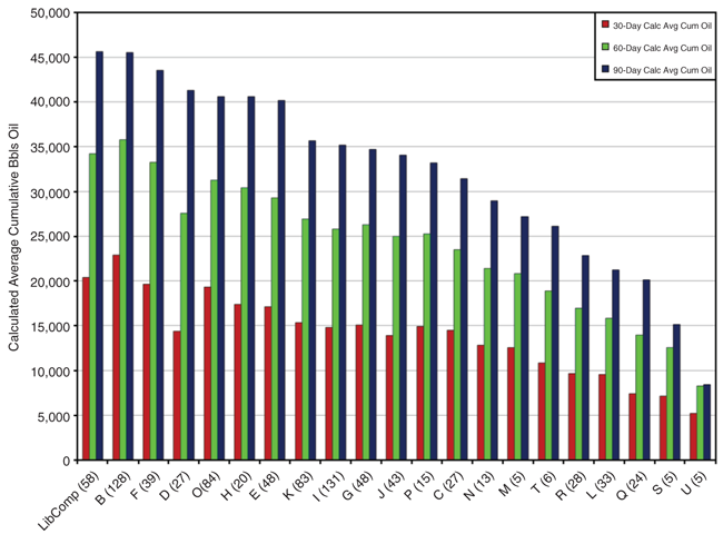 Figure 7A is a bar chart of 30-, 60-, and 90-day cumulative oil production for all companies operating at least five wells in the database. As can be seen, there is a wide range of performance.