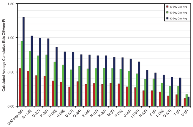 Similarly, differences in flow-back procedures and choke settings in the early operating philosophies of different operators also yielded significant variations in 30-day cumulative production data.