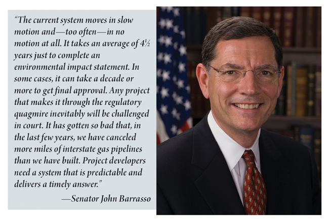 “The current system moves in slow motion and—too often—in no motion at all,” he describes. “It takes an average of 41⁄2 years just to complete an environmental impact statement. In some cases, it can take a decade or more to get final approval. Any project that makes it through the regulatory quagmire inevitably will be challenged in court. It has gotten so bad that, in the last few years, we have canceled more miles of interstate gas pipelines than we have built. Project developers need a system that is predictable and delivers a timely answer.”