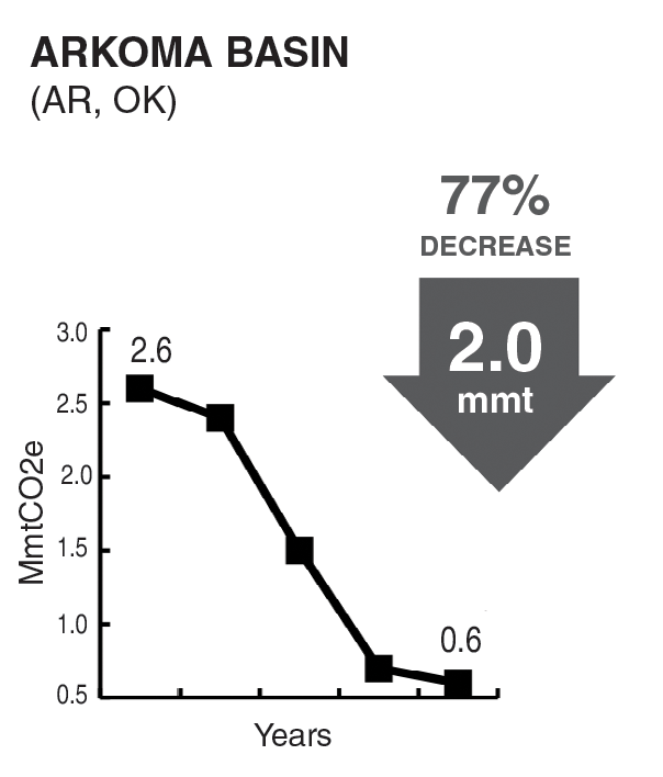 The largest decrease in total volume of emissions occurred in the Anadarko Basin, located in Oklahoma, Texas and Kansas. The Arkoma Basin was responsible for the largest percentage decrease in methane emissions, slashing emissions of the greenhouse gas by an impressive 77% during the past half-decade.