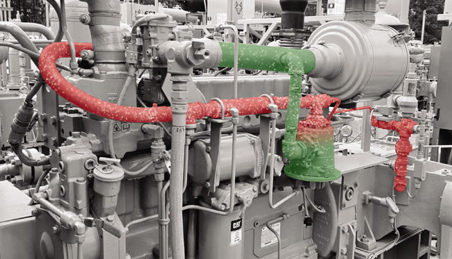 This compressor is equipped with a methane abatement system from Flowco that captures fugitive emissions from common leak points, then redirects the captured methane into the engine’s air intake for combustion. The company says the red-to-green coloring shows the methane being converted from harmful emissions (red) to useful fuel (green).
