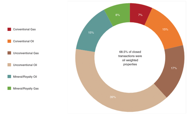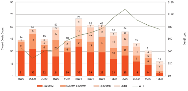 The overall market sentiment of buyers and sellers of properties remains more bullish for oil, with the commodity dominating the transactions market. Oil weighted properties represented slightly more than two-thirds of deals closed in the trailing 12 months ending 1Q23 (Figure 2). Despite the volatility, perceptions of a range bound oil price between $60 and $70 a barrel have helped get deals across the finish line.