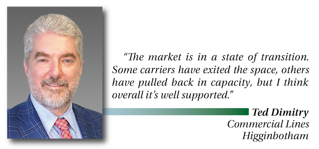 Ted Dimitry, who handles commercial lines at Higginbotham, describes the current marketplace as a sector undergoing recalibration, not contraction. “The market is in a state of transition,” Dimitry says. “Some carriers have exited the space, others have pulled back in capacity, but I think overall it’s well supported. I don’t see it drying up completely.”