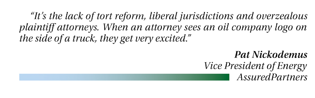 Nickodemus sees the same litigation trends affecting other areas. “It’s the lack of tort reform, liberal jurisdictions and overzealous plaintiff attorneys,” he says. “When an attorney sees an oil company logo on the side of a truck, they get very excited.”