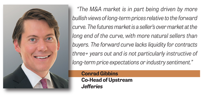 “The M&A market is in part being driven by more bullish views of long-term prices relative to the forward curve,” Gibbins assesses. “The futures market is a seller’s over market at the long end of the curve, with more natural sellers than buyers. The forward curve lacks liquidity for contracts three+ years out and is not particularly instructive of long-term price expectations or industry sentiment.