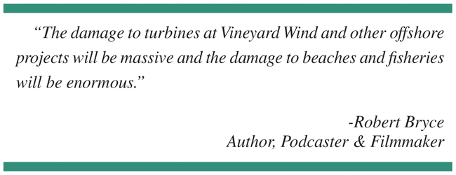 “The crucial part of Ketchum’s statement, is, of course, ‘the threat of hurricanes,’” Bryce muses. “If GE’s wind turbine blades are coming apart now, during a calm summer day, imagine the calamity when a large hurricane slams the Eastern Seaboard. The damage to turbines at Vineyard Wind and other offshore projects will be massive and the damage to beaches and fisheries will be enormous.”