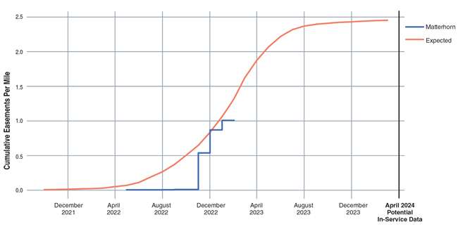 As shown in Figure 1, Matterhorn began serious efforts to acquire land rights in November 2022. Based on similar projects, the pipeline could be in service by the middle of 2024, which is a bit earlier than its announced date of the third quarter of 2024.