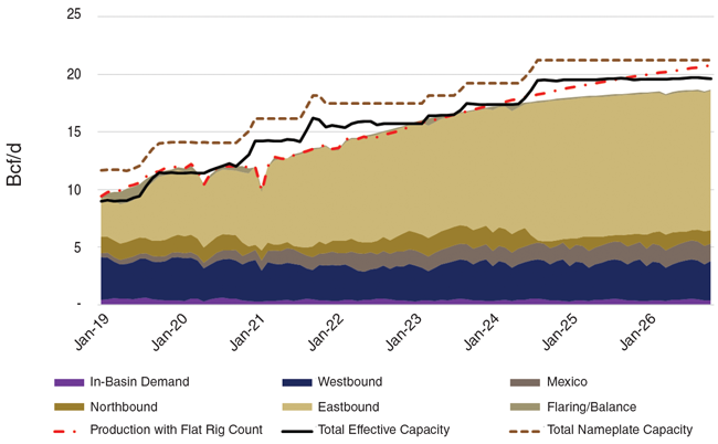 Analysis by East Daley Analytics suggests that if producers maintain the rig count, that could easily drive the additional interest needed to secure the commitments necessary for future expansions, such as Warrior. But for now, Figure 3 shows how the three other mainline projects will impact flows out of the Permian in the coming years.