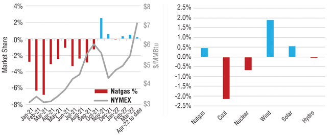 As the left graph in Figure 2 shows, natural gas power generation’s market share has increased year-on-year since November 2021 (blue bars, left axis) despite prices climbing from the $3.00-$4.00/MMBtu range earlier in 2021 to $4.00-$7.00/MMBtu later in the year and even higher in 2022 (gray line). Moreover, as the graph to the right in Figure 2 indicates, gas market share climbed even with increases in wind and solar generation. Rather, coal gave up its piece of the power-generation pie, along with nuclear to a smaller extent. In other words, even at much higher prices, gas gained market share relative to coal.