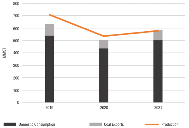 At the same time, outright volumes of domestic coal consumption (dark gray bar segments in Figure 3) and coal exports (light gray segments) rose a combined 81.7 MMST (16%) year-on-year in 2021. Coal’s share of total power sector fuel demand was also higher year-on-year for most months in 2021, until November, when it began losing ground to other fuels, including natural gas.