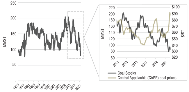 The lag in production relative to domestic demand and exports in 2021 left U.S. coal stockpiles at their lowest levels in decades and coal prices at historical highs (Figure 4), particularly in the U.S. Northeast, which accounts for about 60% of the country’s coal exports. Coal stocks for the U.S. electric power sector in the second half of 2021 fell to the lowest on record, according to EIA data going back to 1973, and were sitting below 100 MMST in December for the first time since 1974.