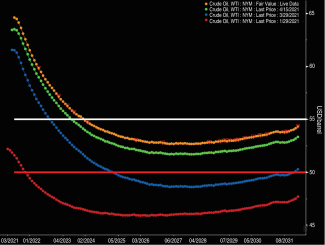 The smaller basins–including the Ardmore, San Joaquin and Cherokee–will see a seasonal bump in completions in April and May, which we also factored in, but at a lower rate. Instead, we saw a wave of activations at the end of April, bringing us to the current level. The crude futures price curve holding well above $55 through December 2023 offers an opportunity to protect downside at favorable pricing (Figure 1).
