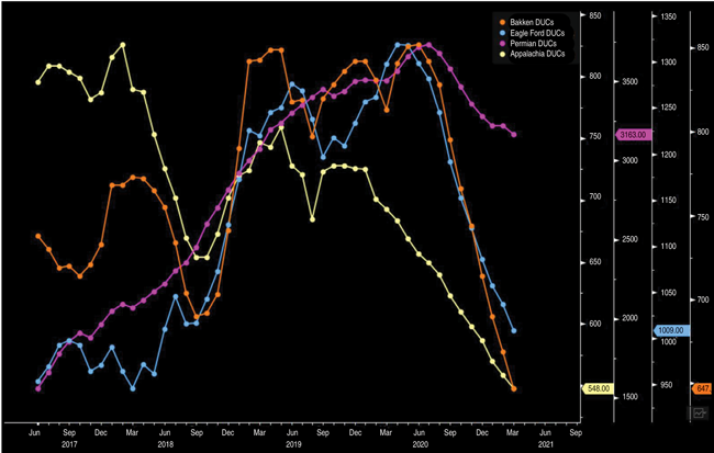 The biggest growth area has been the Permian Basin (shocking, we know), where we have seen the lion’s share of activity. The Permian is starting to level off on DUC drawdowns (Figure 2), but the inventory has been depleted in key areas, such as the Eagle Ford and Bakken. At the current rate of activity, the Bakken will see steady production declines. There is typically an increase in completion crews as winter ends and the “spring thaw” sets in, but the uncertainty around the Dakota Access Pipeline will limit the amount of activity in the region. Until that is cleared, Bakken operators will look to steady declines but not grow in the region or invest in replenishing DUCs in any meaningful capacity.