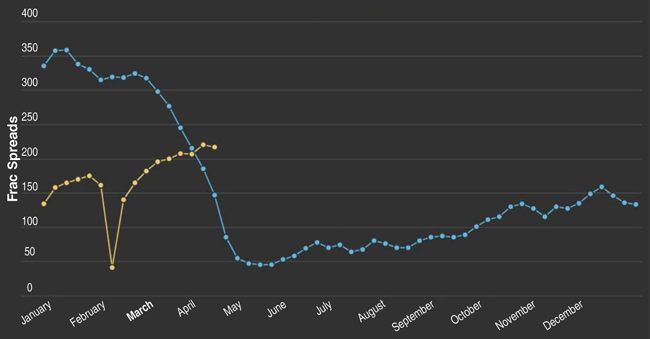 Pressure pumpers will have to create unique partnerships with operators or tap their improving credit lines to place electric spread orders that often double the price of traditional equipment. The return on investment just is not there quite yet. Nothing happens, anyway, until the market sees COVID-19’s exit strategy.