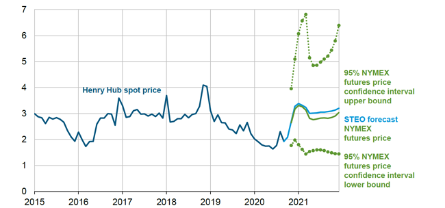 In the October Short-Term Energy Outlook, EIA says monthly average spot prices will remain higher than $3.00/MMBtu throughout all of 2021, averaging $3.13/MMBtu for the year, which would be up from an average of $2.07/MMBtu in 2020 (Figure 1).