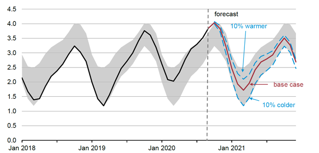 As always, however, EIA notes that weather is a major wildcard in wintertime demand and storage drawdown. Looking at various alternate weather scenarios, EIA would anticipate 17% more U.S. residential natural gas consumption than last winter if actual temperatures are 10% colder than NOAA’s current forecast, leaving end-of-March storage at 1.2 Tcf, or 35% below the five-year average. Under a 10% warmer-than-forecast scenario, end-of-winter inventories would be 2.1 Tcf, or 14% above the five-year average (Figure 2).